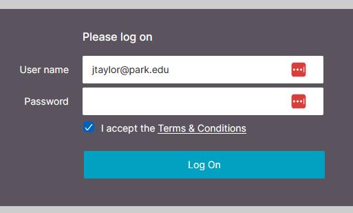 - Log in with your user logon name (Example wtripp@park.edu) and password (The Park ID number does not work)